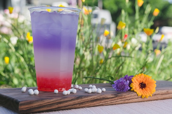 BUTTERFLY LEMONADE: Butterfly pea flower tea and lemonade with tapioca pearls.