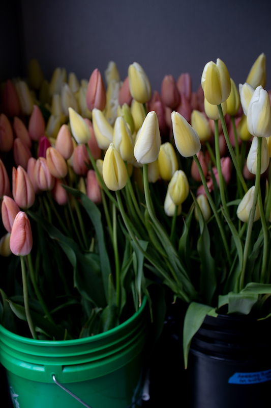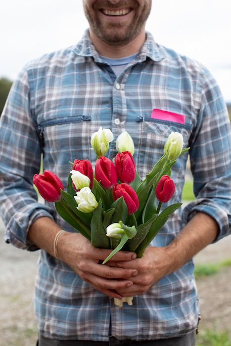 “We kind of struggle with whether to leave the flowers for the bees or cut them,” she chuckles, clipping a couple of peachy Blushing Beauty tulips for me. Luckily, between the springtime landscape and hedgerow plants like ceanothus, honey locust, and salvia, to the abundance of summer blooms—lavender, snapdragons, bee balm, zinnias, goldenrod, scabiosa—to the fall chrysanthemums and sunflowers, there are plenty to go around.