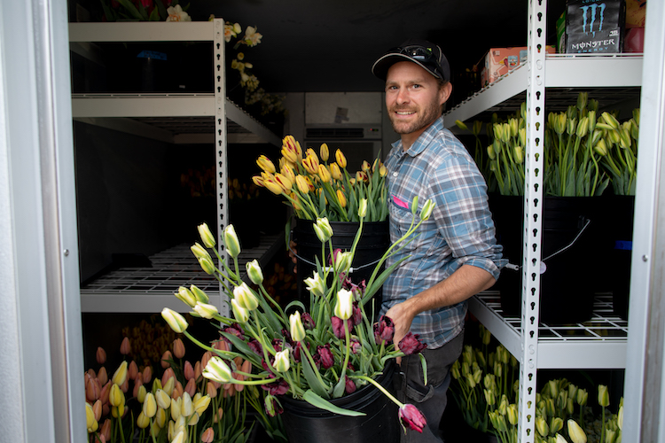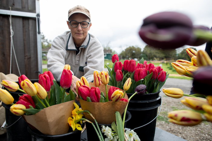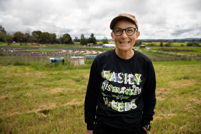 “Every almond needs a bee,” says Susan Kegley, who runs Bees N Blooms farm on Petaluma Hill Road at the foot of Taylor Mountain. It’s the first Friday of spring, a wet gray day. After loaning me a raincoat, Kegley’s giving me a tour of the 11 acres that she and her husband Geoff have transformed into a cut flower farm anchored by a meticulously constructed lavender labyrinth.
