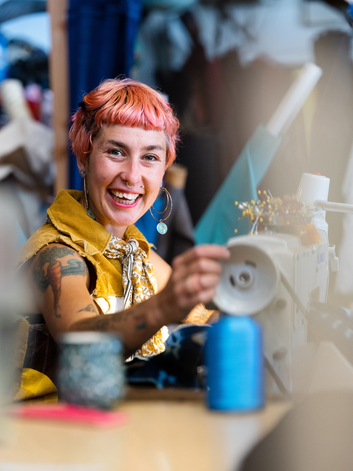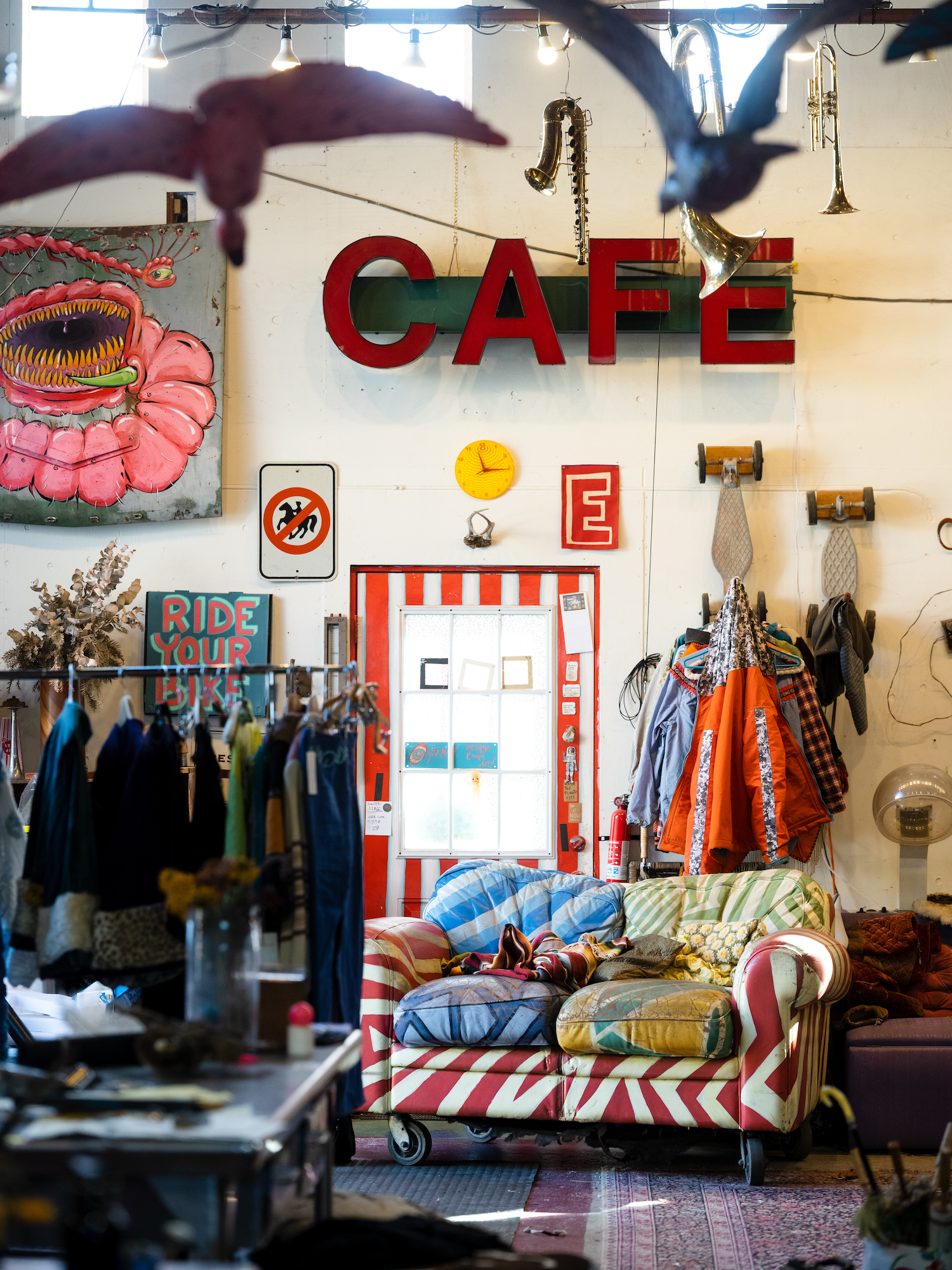 Although their clothing is possibly the most accessible of their creations, it is just “one tentacle of the octopus” that is BigMouthUnique. Partners in business and in life, Joshua is a “lifelong doer, maker and producer,” and Mathilde was raised by local “junk art” royalty Patrick Amiot and Brigitte Laurent, which she conceptualizes as “art school all the time.”