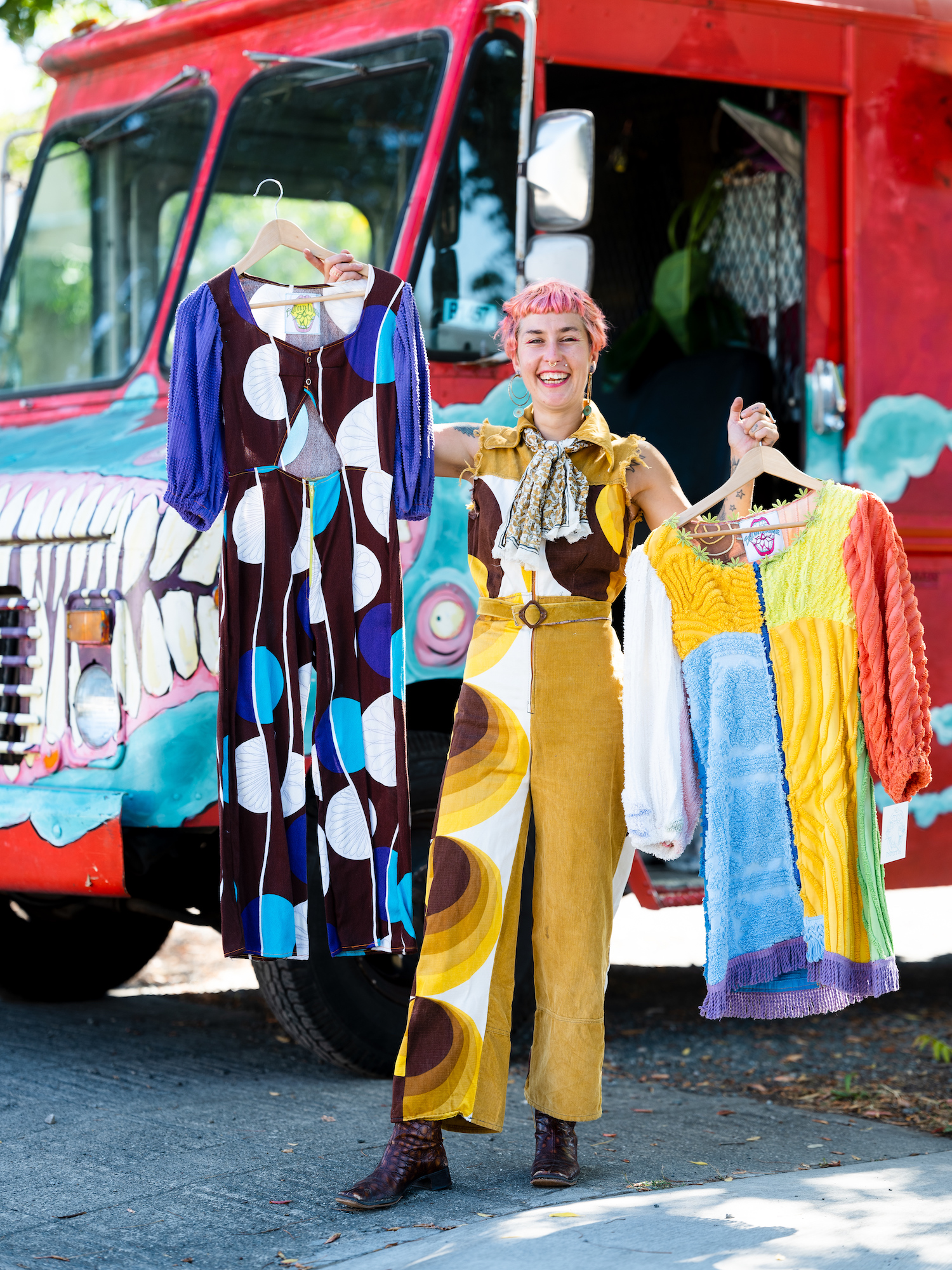 “I didn’t do sewing school or formal education, so we wing it,” she tells me. “I make things that I wish I had; I wish there were more bright, colorful, fun clothes available, so that’s what I make. The fabric inspires the thing. I don’t think about it ahead of time.” The result is brilliant cohesive chaos.