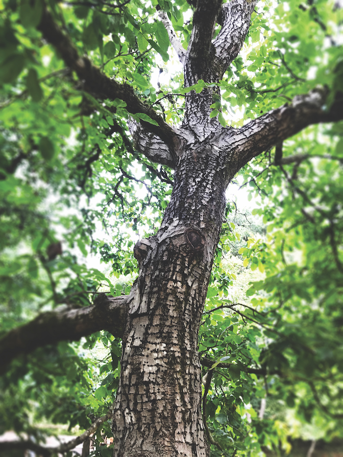If the tree above you has floppy, oval, avocado green leaves, it’s an English or Persian walnut (Juglans regia). This tree is the result of an ancient hybrid, tracing back to our shores 35 to 45 million years ago, contrary to long-held belief. This is the nut you eat in ivory handfuls, subtly sweet, easy to crack.The naked kernel is shaped and fissured like a brain, to which it has been compared for centuries.