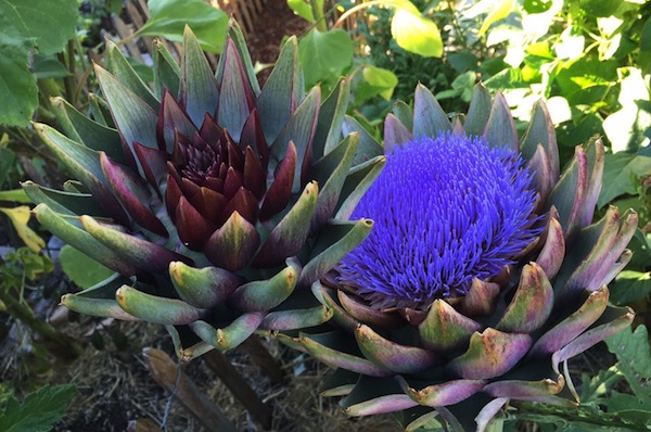 Artichokes are my favorite vegetable, but even if I wasn’t partial to the edible part, I’d still grow them for their plant appeal. It’s a perennial vegetable, so you only need to plant it once for years of production. With large silver gray jagged leaves, this structural plant is one that can pass as a veggie or a landscape plant. I like planting as an understory to fruit trees, but it’s also great in a modern or a cottage garden landscape. In the spring, you’ll be rewarded with delicious artichokes, which are actually the buds of the flower. If left unpicked, they unfold into neon purple pincushion flowers that the bees just love.